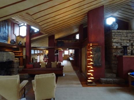 Een enorm contrast met de grauwe wereld van armoede is het idyllische Taliesin, een uurtje rijden van Madison. Taliesin ligt in een prachtige vallei, aan de Wisconsin River, dicht bij het plaatsje Spring Green. Golvende heuvels, bossen, mooie houten boerderijen en exotische plaatsnamen als Palmyra, Baraboo, Eau Claire, Oxford, London (population 476) en Barneveld (population 19.346). Je wordt vanuit een bezoekerscentrum aan de rivier met een busje naar het hoofdcomplex gebracht, en krijgt daar een guided tour. Ik vond het één van de mooiste gebouwen die ik ooit heb gezien. Het ligt ín het landschap, veel horizontale lijnen, natuurlijke materialen, en het is geheel in harmonie met het omliggende – gedeeltelijk ook door FWL vormgegeven – landschap In de tijd waarin het gebouwd werd functioneerde een groot gedeelte ervan ook werkelijk als boerderij. Wright kwam zelf uit een Welshe familie van boeren en dominees. De meubels en de inrichting van de ruimtes waar je naar binnen kunt, het atelier en FLW’s woonhuis, zijn van fundament tot stopcontact door hem zelf ontworpen. Hij hechtte ontzettend aan lichtval en atmosfeer en arrangeerde liefst zelf bloemstukken en de presentatie van zijn vooral Japanse kunstvoorwerpen. Bij het zien van zijn meubels wordt het je meteen duidelijk hoe schatplichtig Rietveld bijvoorbeeld aan hem geweest is. Favoriete ‘trucs’ zijn het donker en laag maken van de toegang tot een ruimte, en op het moment dat je dan de kamer zelf binnenkomt is die hoger en licht. Op allerlei plekken is bewust gewerkt aan het juiste uitzicht, door een raam zus of zo te plaatsen, een bepaald formaat te geven, hoekstijlen bij ramen weg te laten en materiaalgebruik aan het beoogde effect aan te passen. Veel materialen zijn ook de lokaal gewonnen zandsteen, hout, leem en kalk met zand van de Wisconsin River erdoor.