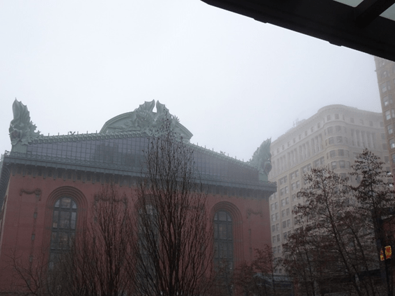 Uit de mist doemde ineens een groot mysterieus gebouw op, met enorme ornamentale beesten op de gevel. Een 19e eeuws station? Een concerthal? Het bleek de nieuwe openbare bibliotheek, de Harold Washington Library in postmoderne stijl van Thomas Beeby te zijn. Van buiten een ontzettend indrukwekkend gebouw. Een bezoek binnen, op een later tijdstip, was wat teleurstellend. De grandeur die het van buiten uitstraalt werd wat teniet gedaan door een wat hokkerig interieur met lage zolderingen.
