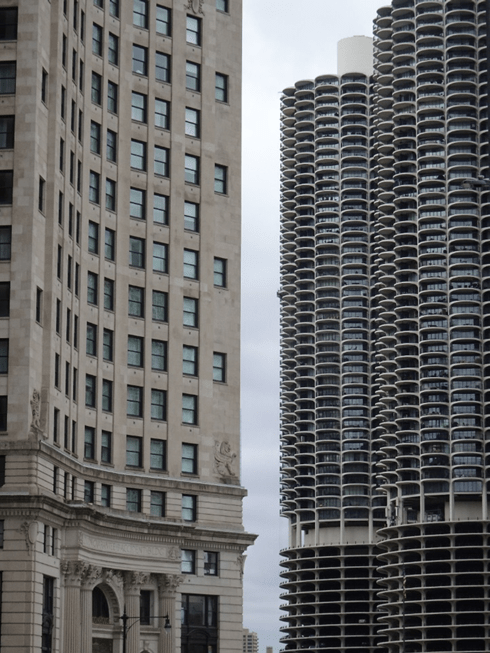 De geblakerde resten werden het meer in gebulldozerd, en is wat nu de ondergrond voor lakeside vormt, waar bijvoorbeeld het Millennium Park en het Art Institute liggen. Na de brand werd er veel en snel herbouwd, en verrezen de grote wolkenkrabbers van architecten als Louis Sullivan en Daniel Burnham. In 1893 vond de wereldtentoonstelling in Chicago plaats, uit die tijd stamt ook de term ‘windy city’, geen verwijzing naar het klimaat, maar naar de opgeblazen retoriek van het comitee dat de prijsvraag voor de Columbian Exhibition in Chicago bepleitte. In het centrum ook de iconische wolkenkrabbers als het Wrigley Building (1920) en het gebouw van de Chicago Tribune (1925). In films die in Chicago spelen zie je steevast de twee ronde torens van Marina City opduiken, parkeergarages op de onderste verdiepingen met daarboven appartementen.