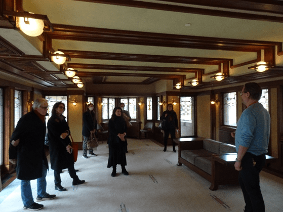 Robie House met links Debbie Kempe (voormalig hoofd Frick Library) en haar man