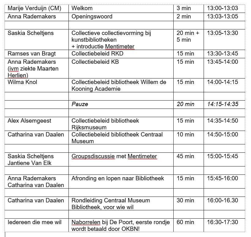 Op deze bijeenkomst hebben diverse bibliotheken hun collectiebeleid voorgesteld. Sommige zijn nieuw en formeel, andere zitten nog volop in ontwikkeling of zijn louter informeel omdat er zo veel verandert. Deze bijeenkomst kan gezien worden als een startschot om verdere samenwerking op het gebied van collectievorming binnen het OKBN te stimuleren.